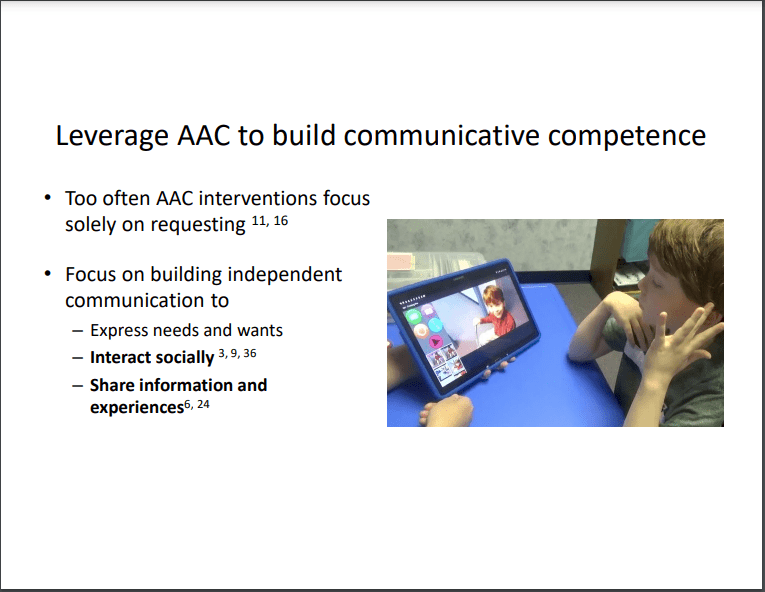 Current AAC interventions tend to focus on requesting; we have an opportunity to build communicative competence for individuals on the autism spectrum by leveraging the power of AAC to support independent communication for multiple purposes.