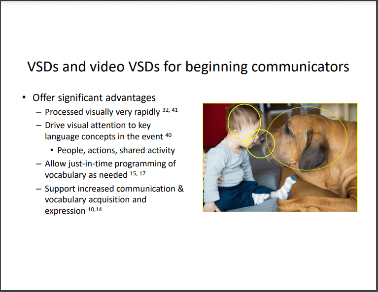 Babb, S., McNaughton, D., Light, J., & Caron, J. (2021). “Two friends spending time together”: The impact of video visual scene displays on peer social interaction for adolescents with autism spectrum disorder. Language Speech and Hearing Services in Schools, 52, 1095-1108. doi:10.1044/2021_LSHSS-21-00016 (summary with video examples)